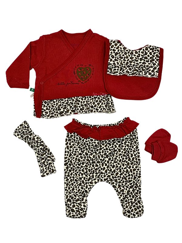 Βρεφικό σετ βαμβακερό πέντε κομμάτια μπορντό, το σετ αποτελείται από ιδιαίτερο μπλουζάκι, παντελόνι, ασορτί σαλιάρα, γαντάκια και κορδέλα. Υπέροχη πρόταση για δώρο σε νεογέννητο  που θα ξετρελάνει την μαμά shower party. Σετ νεογέννητου ιδανικό για την έξοδο από το μαιευτήριο.